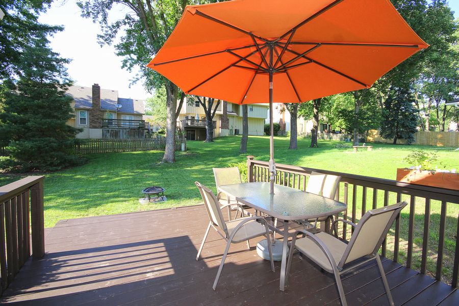 The above image shows the very cute deck that overlooks a backyard with gorgeous trees. The exterior of the home has overall great landscaping with lots of bushes and trees around the front as well.